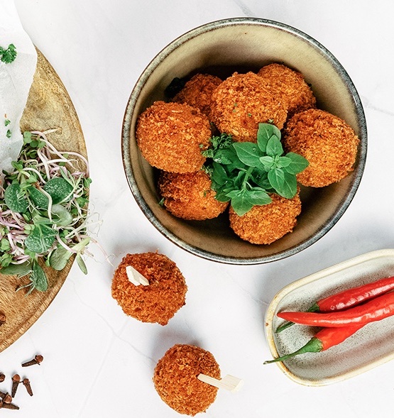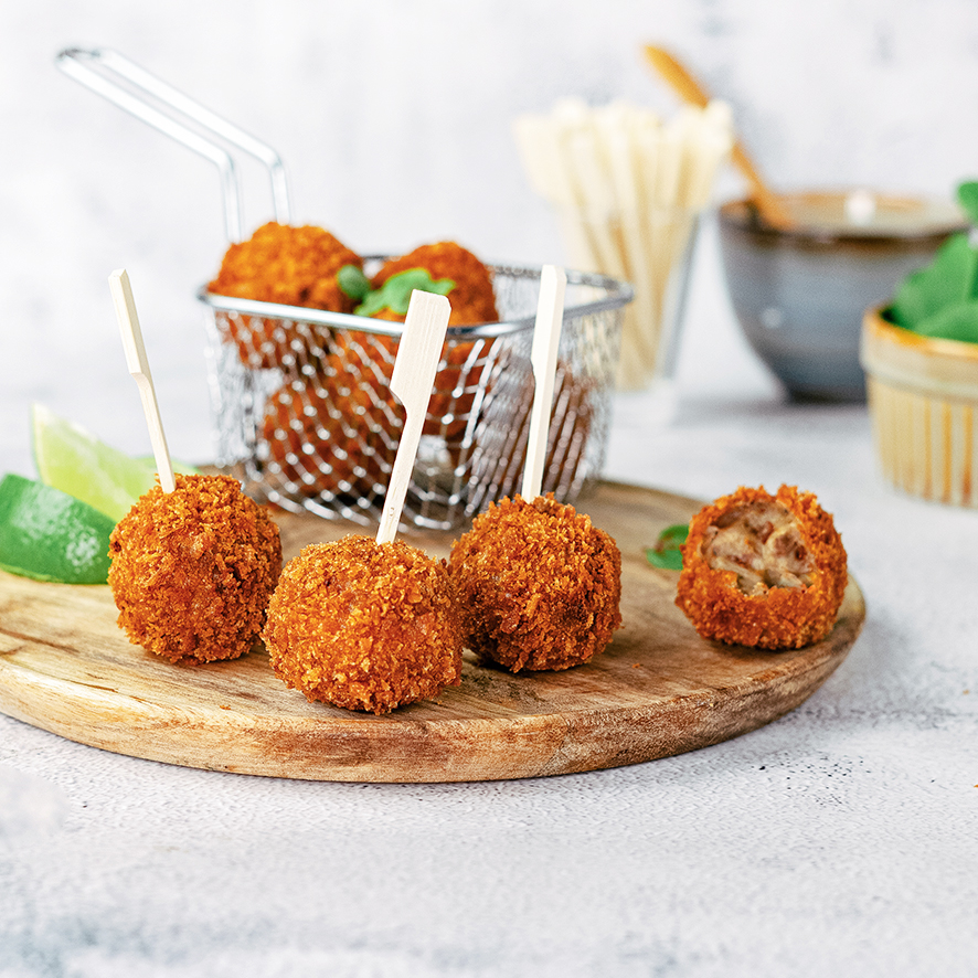The Black Angus bitterbal stands out with its bold and robust flavor. This recipe features 26.5% slow-cooked Black Angus beef, hearty mustard, black pepper, allspice, and Espelette pepper.