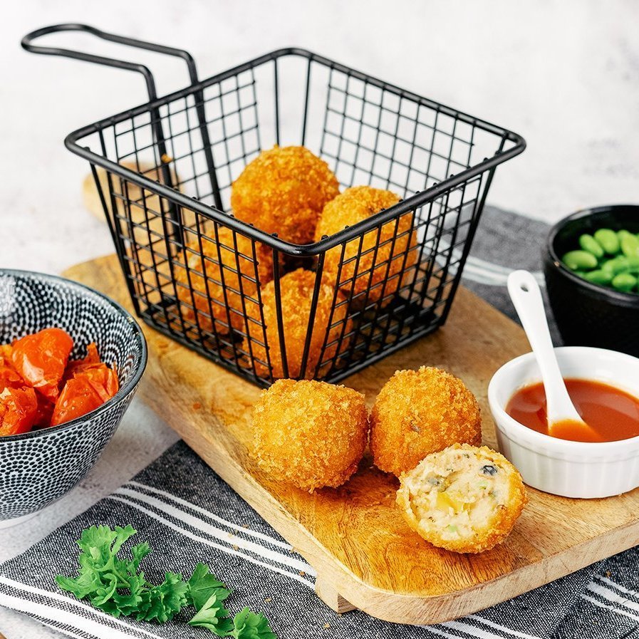 The salpicon base of this flavorful vegetarian bitterbal is made from a strong vegetable broth. It’s filled with vegetables like grilled red and yellow peppers, sun-dried tomatoes, onion, garlic and edamame.