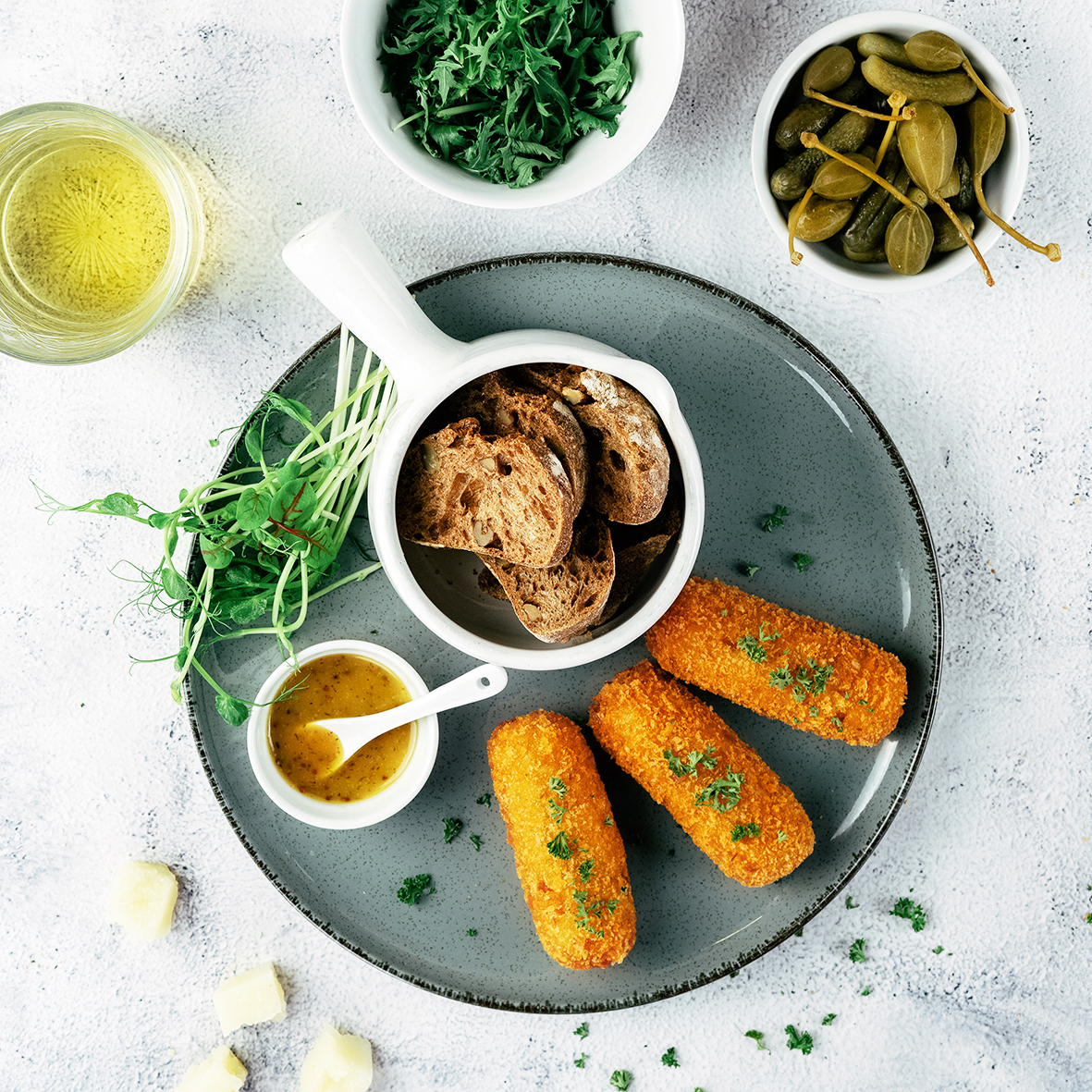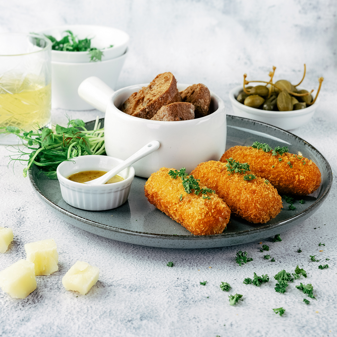The distinct flavor of the aged cheese blend provides a deep and satisfying taste. Perfectly suited to bold beers and fine wines. Available as (mini) croquettes and bitterballen with our unique thin, crispy crust.