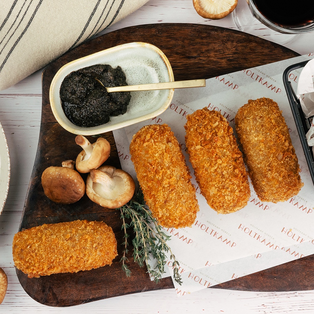 This fully plant-based mushroom truffle (mini) croquette and bitterbal is a welcome addition to the Holtkamp Horeca range. It features a balanced mix of finely diced oyster mushrooms, porcini, shiitake, and nameko mushrooms. The shiny, plant-based mushroom ragout is enriched with 1% finely chopped Italian black truffle.