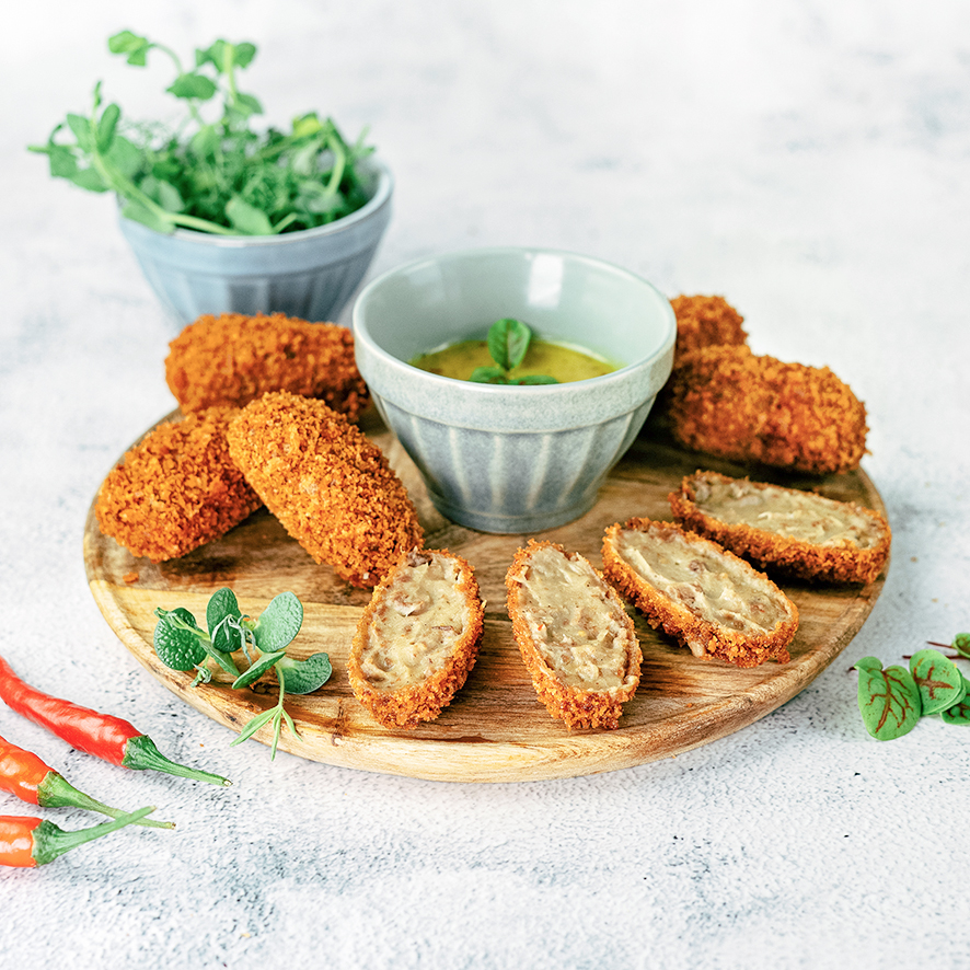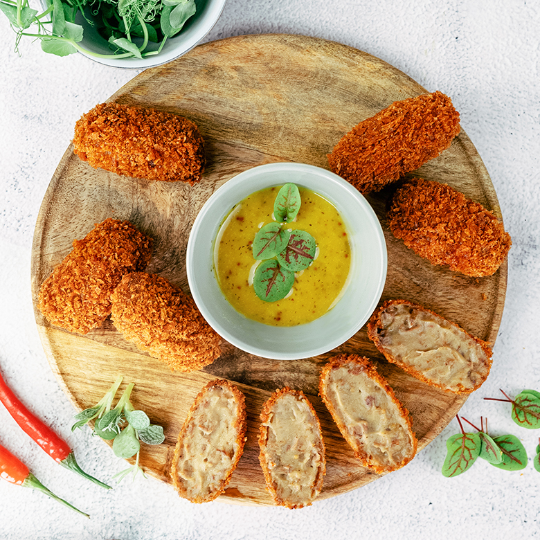 The Black Angus mini croquettes contain a cooked meat filling of 26.5% and stands out with its bold flavor. The addition of robust mustard, black pepper, allspice, fresh vegetables, and Espelette pepper gives the broth of this croquette a powerful and flavorful character.