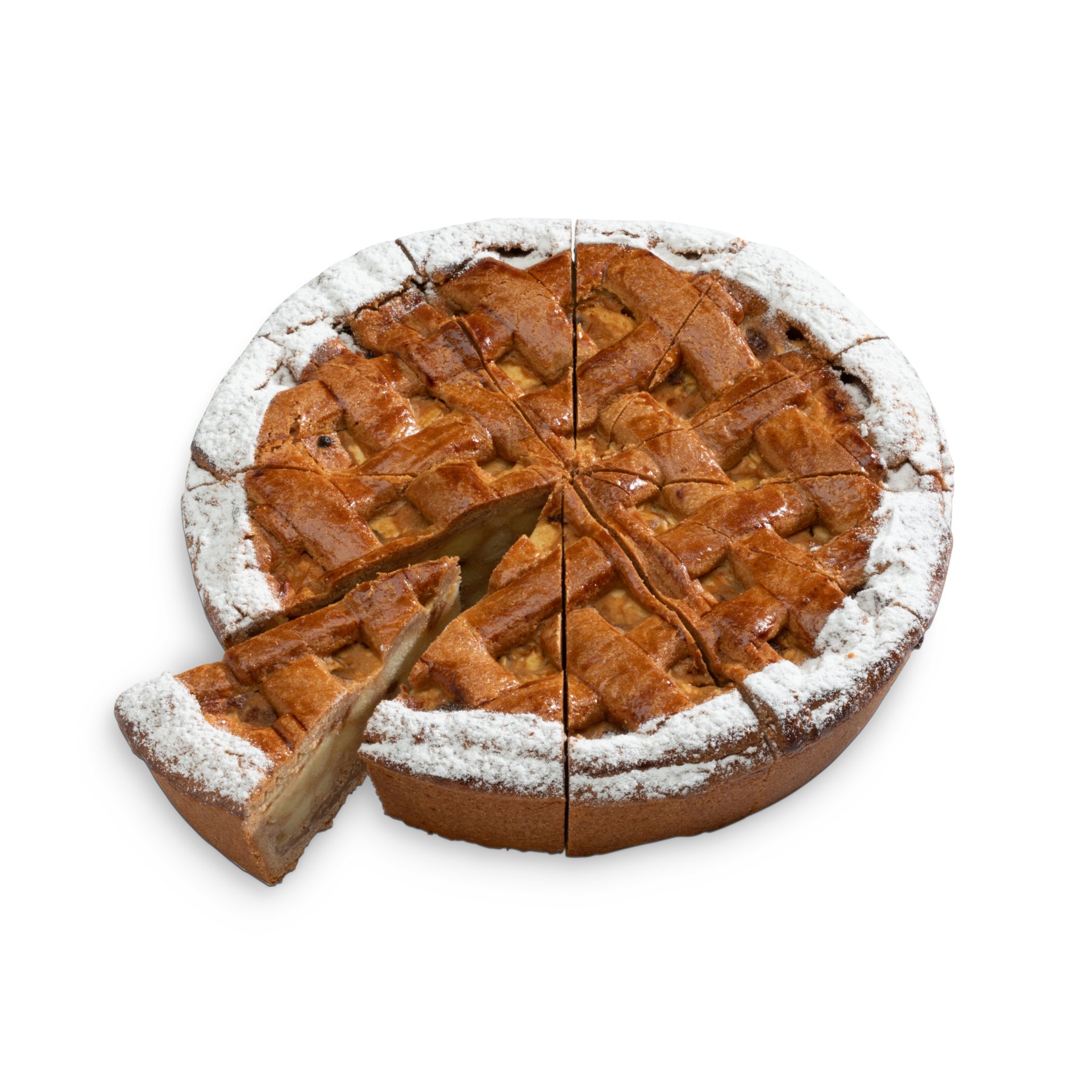 The base is a crunchy cookie crust with a light layer of almond paste. The filling consists of apples, raisins, currants, and a hint of cinnamon. Topped with a lattice of buttery dough and finished with powdered sugar.