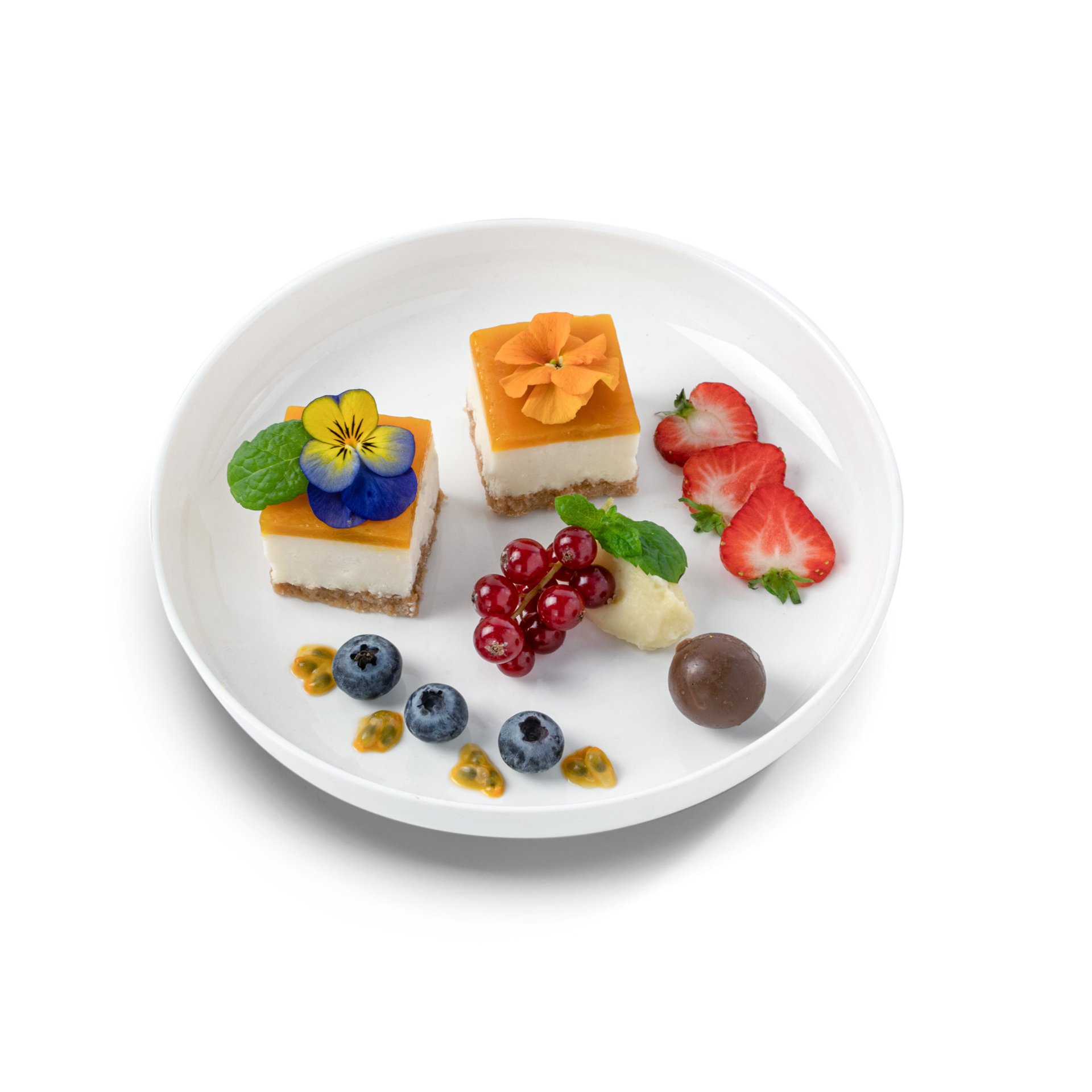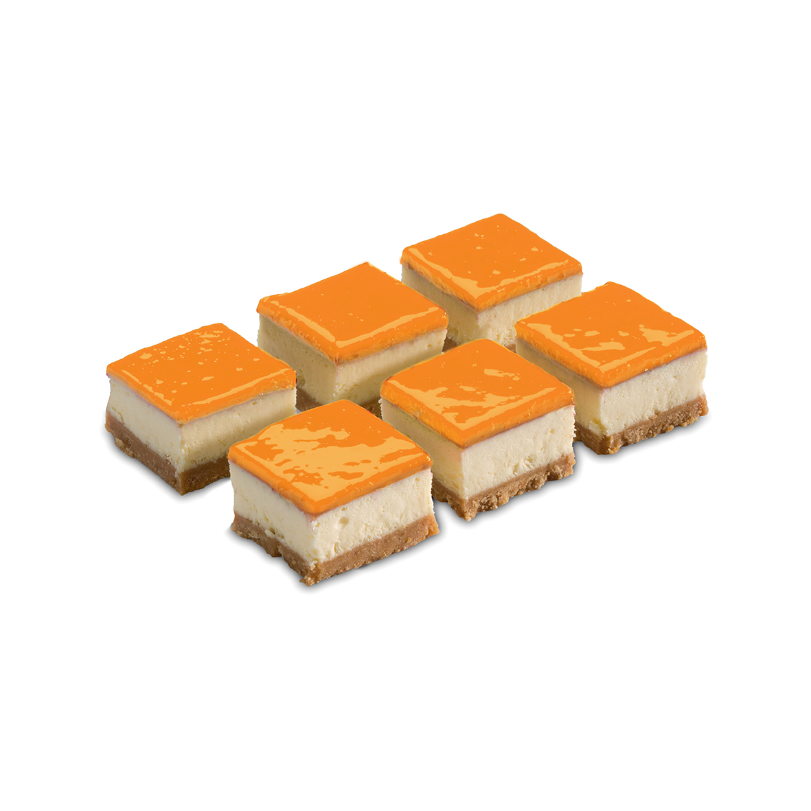 Crispy cookie base with creamy, fresh vegan cheese filling. Topped with a mango-passionfruit jam glaze.