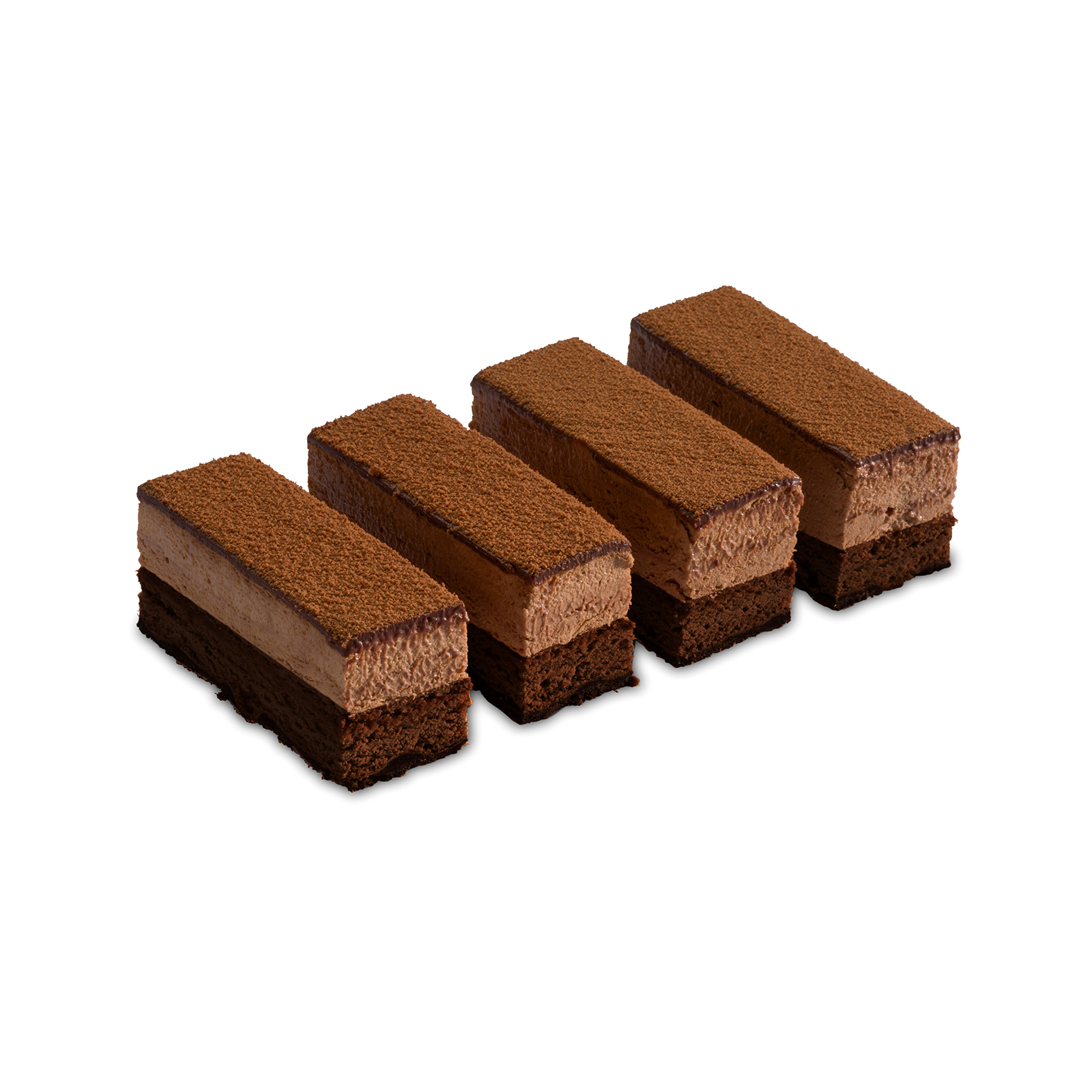 Moist brownie with dark chocolate, filled with airy chocolate mousse, glazed with ganache, and finished with cocoa velvet spray.