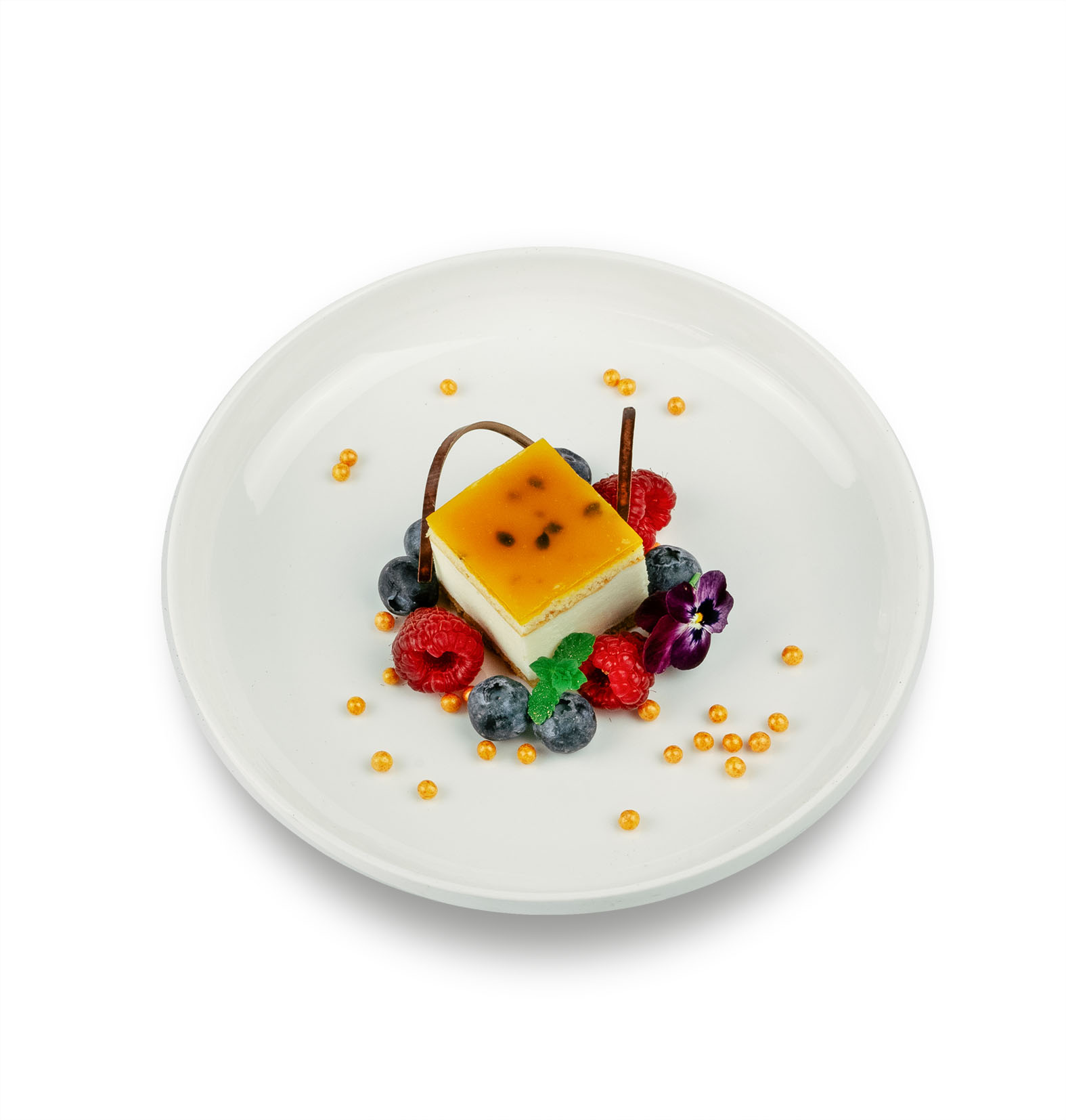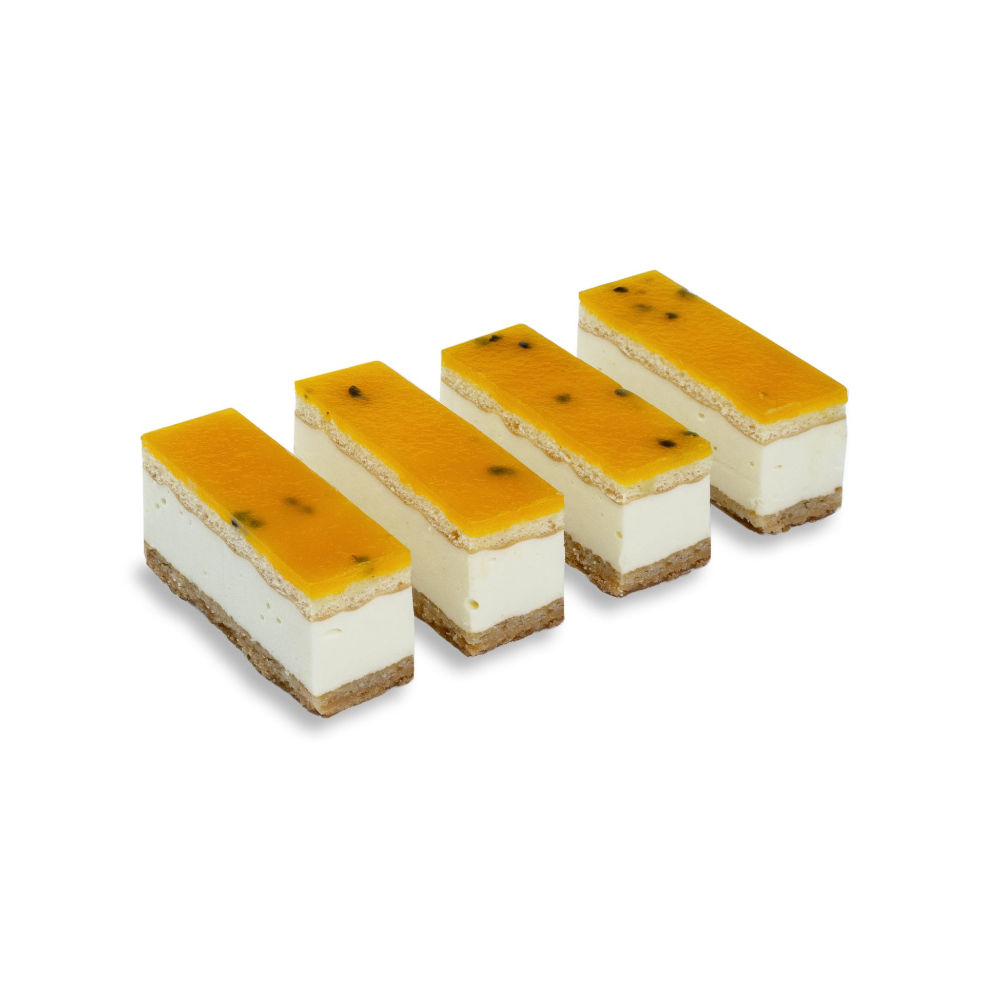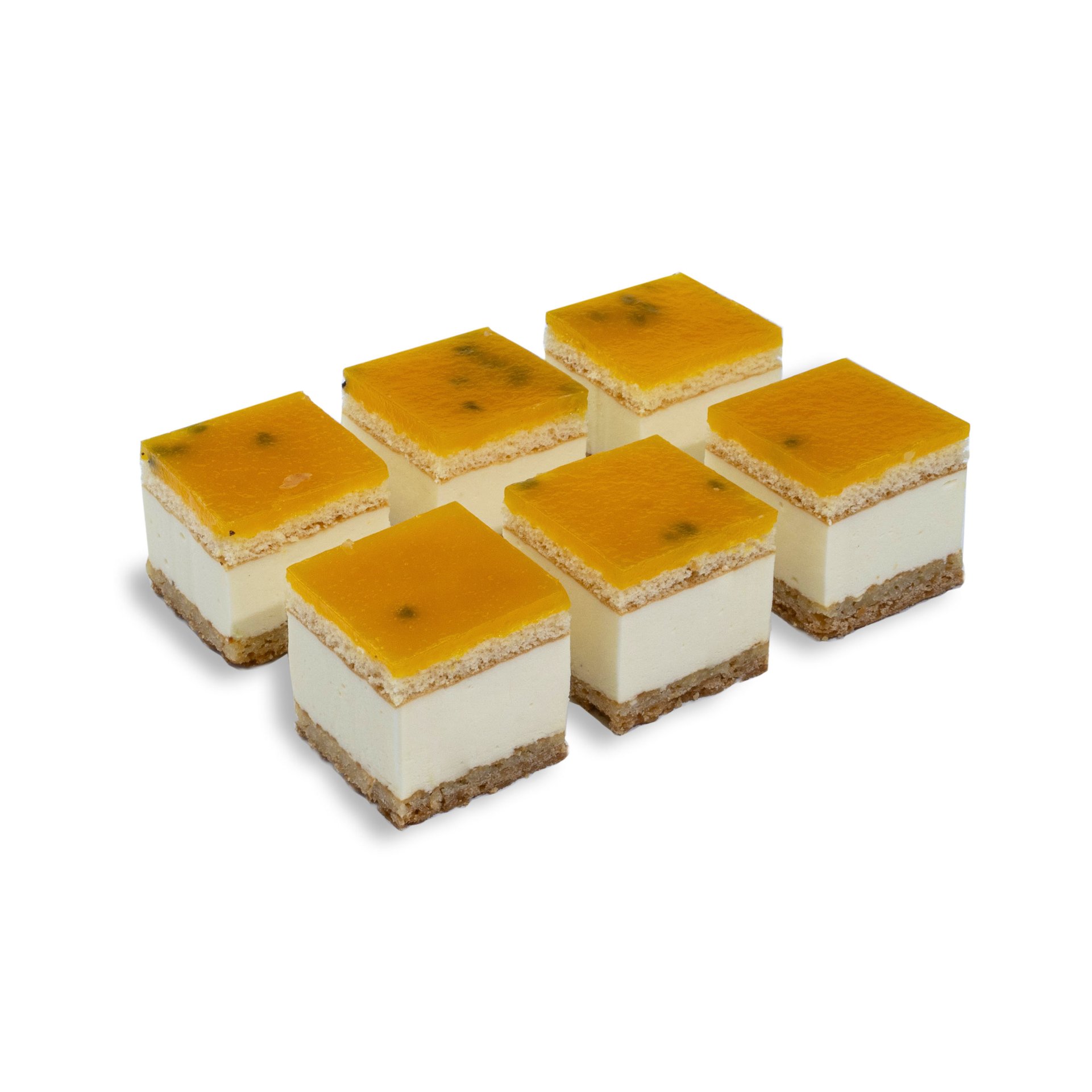 Cookie base with frangipane. Topped with a light white chocolate bavarois. Decorated with a glaze of whole passion fruit with a hint of mango purée.