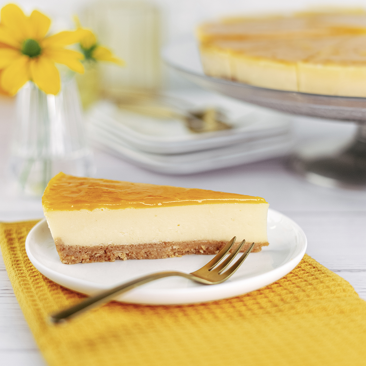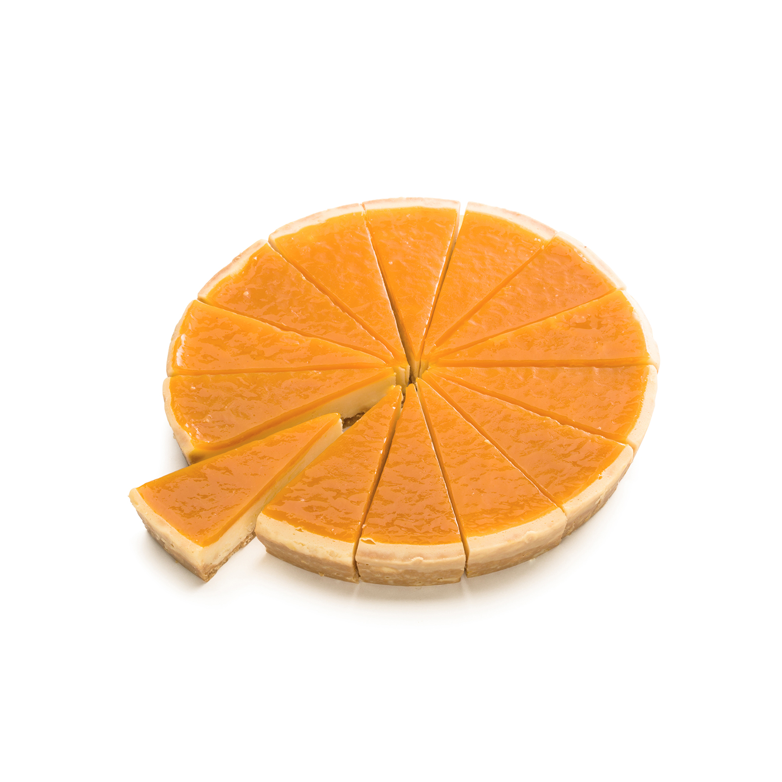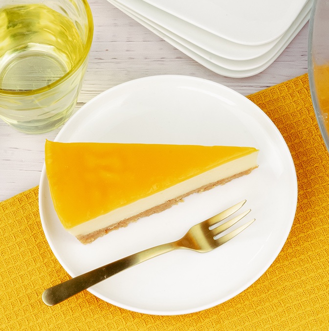 Crispy cookie base with creamy, fresh vegan cheese filling. Topped with a mango-passionfruit jam glaze.